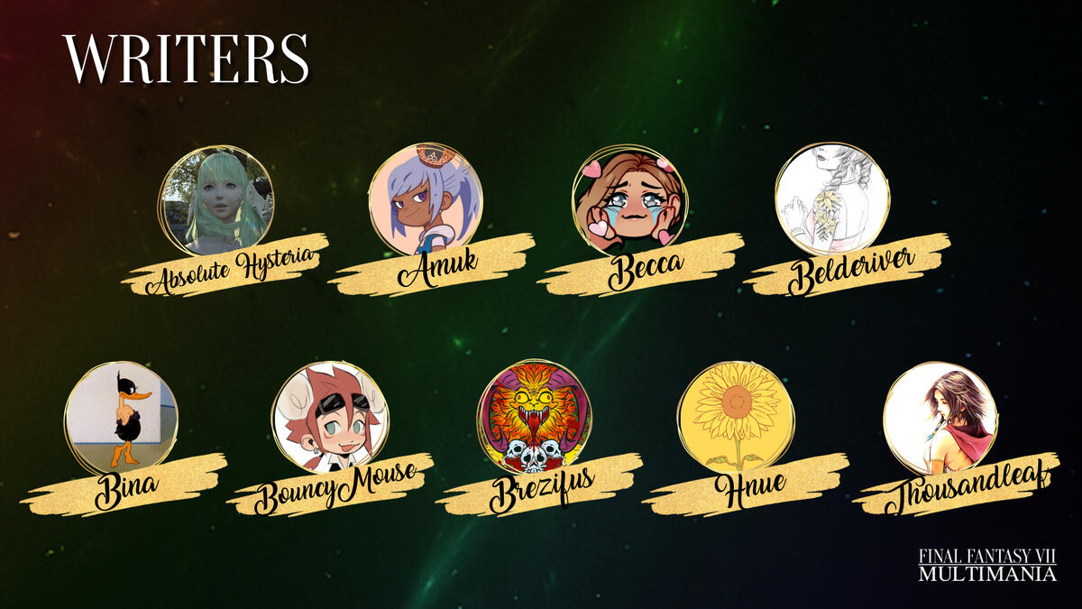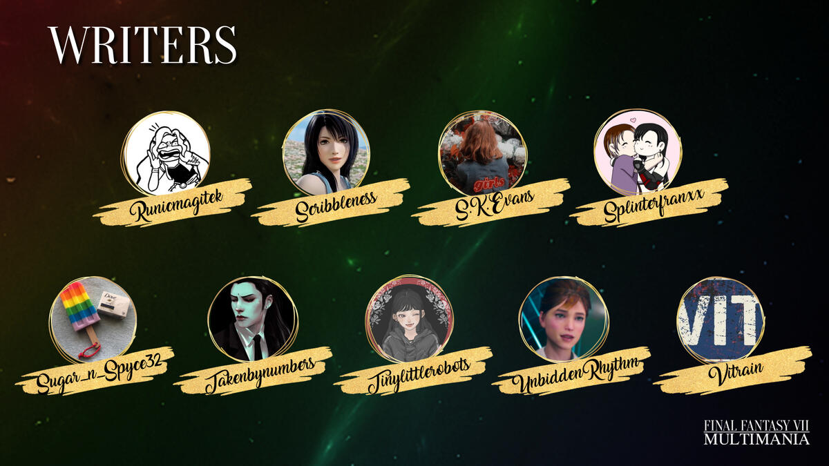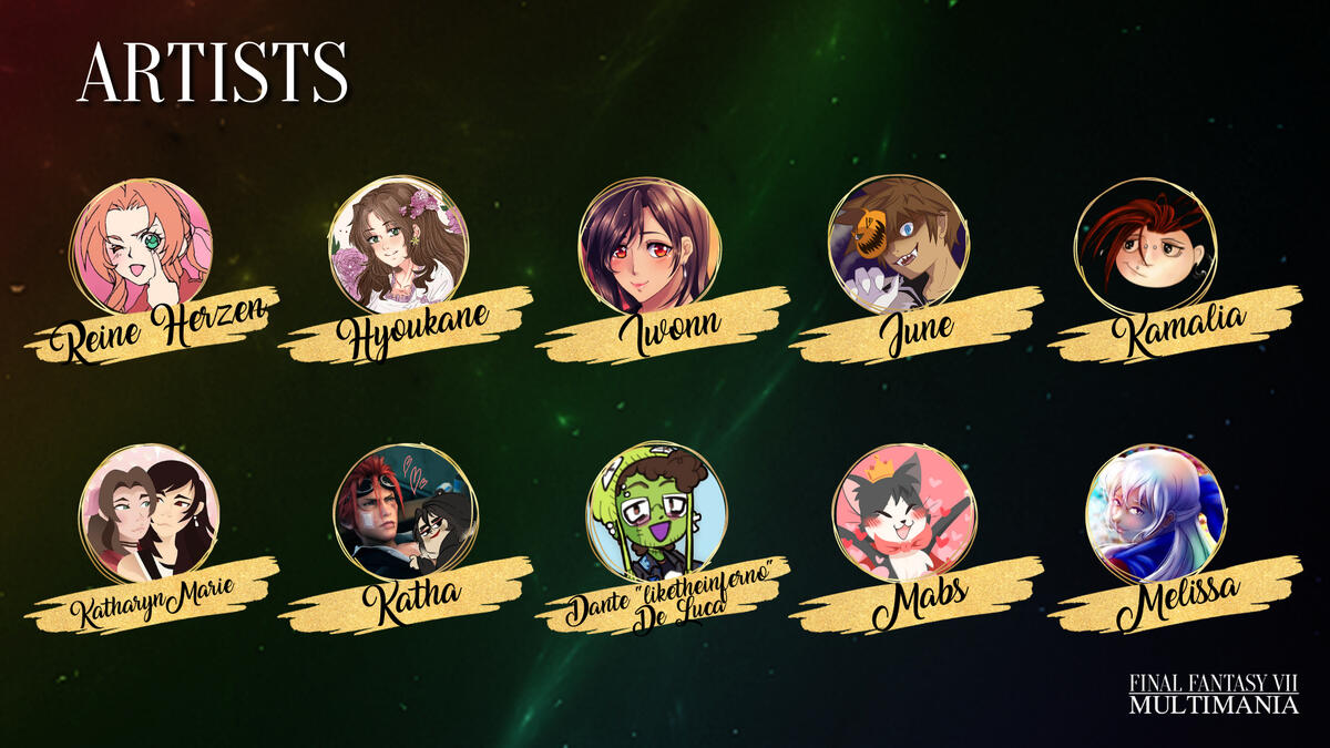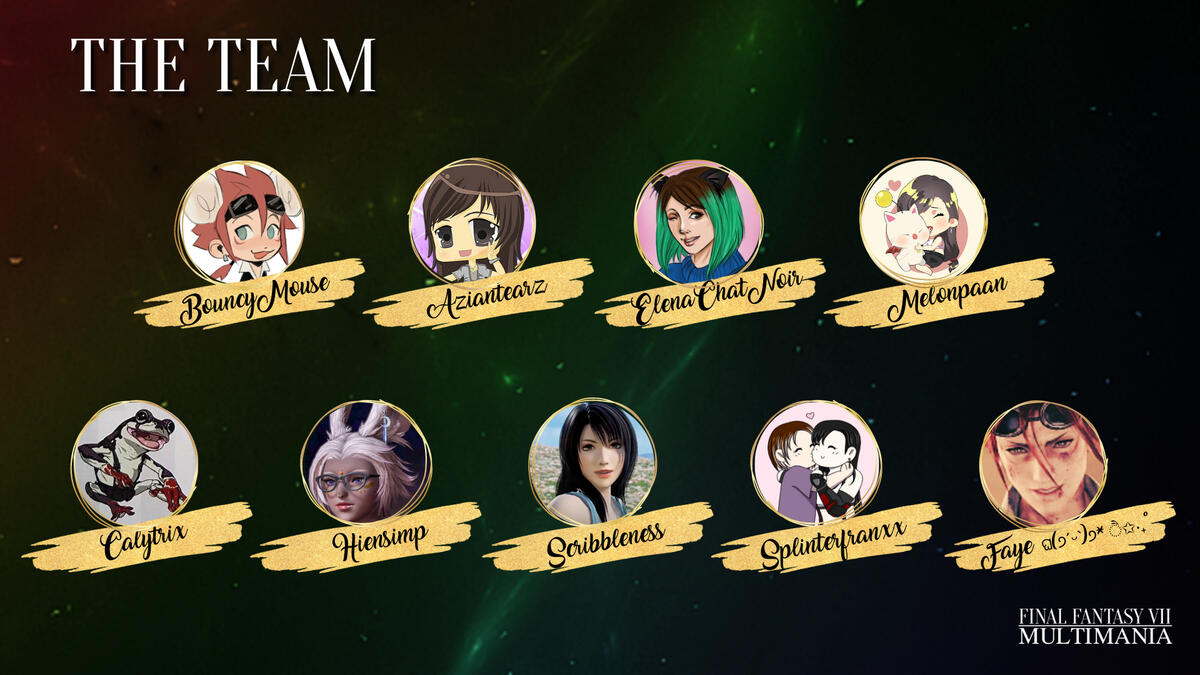 Hello and welcome to FFVII Multimania, a non-profit zine project celebrating shipping in the Final Fantasy VII fandom. We aim to give as many ships as possible a platform/zine experience and raise money for Cybersmile, an international charity that supports victims of cyberbullying.